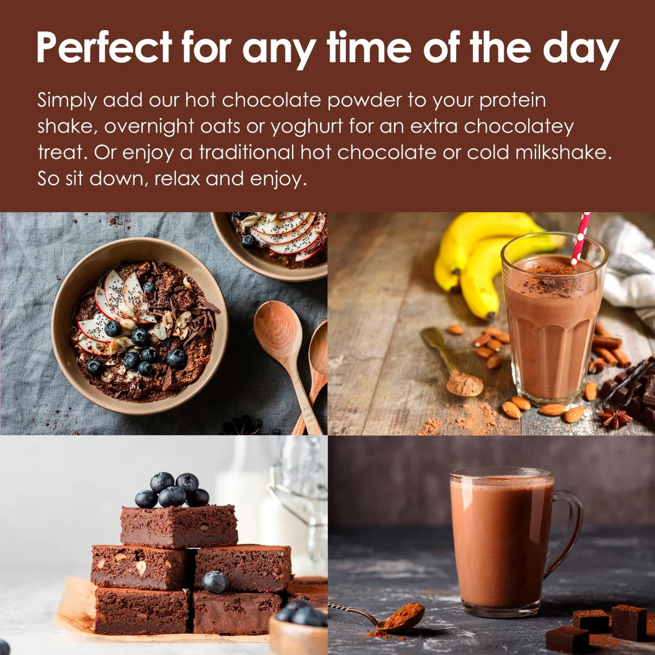 Instant hot chocolate drink with sugars and sweetener. A deliciously satisfying hot chocolate drink for those chocolatey moments that we all love. Perfect for any time of the day, so sit down, relax and enjoy