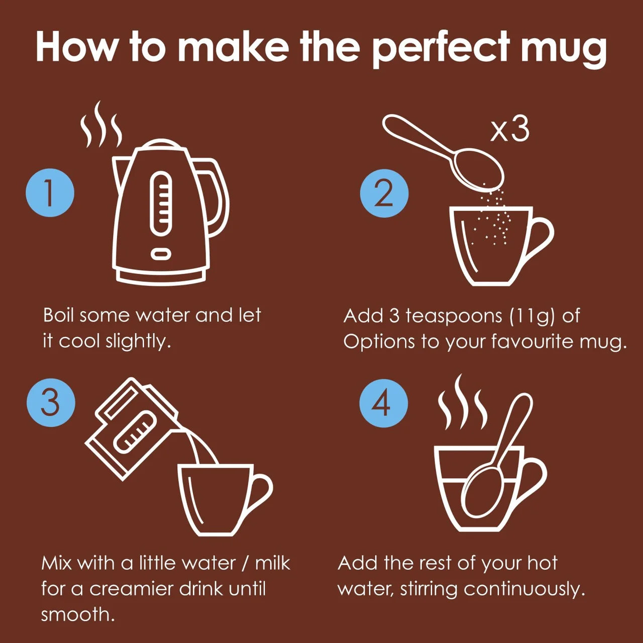 Boil some water and let it cool slightly. Add 3 teaspoons (11g) of Options to your favourite mug and mix with a little water or milk for a creamier drink (or your preferred milk alternative) until smooth. Add the rest of your hot water, stirring continuously.